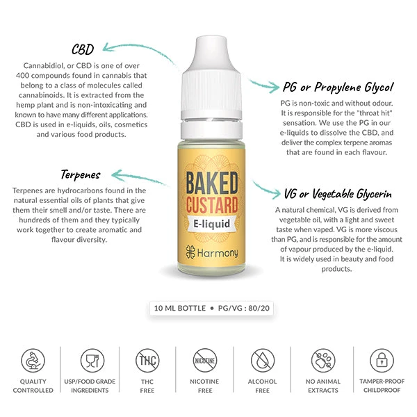 Baked Custard by Harmony CBD is a delightful, much deserved, desert classic that’s rich in flavour with a mouthwatering taste. Harmony Baked Custard has been developed with a slight tweak to the recipe for an exciteful, satisfying vape you could ever get your hands on!