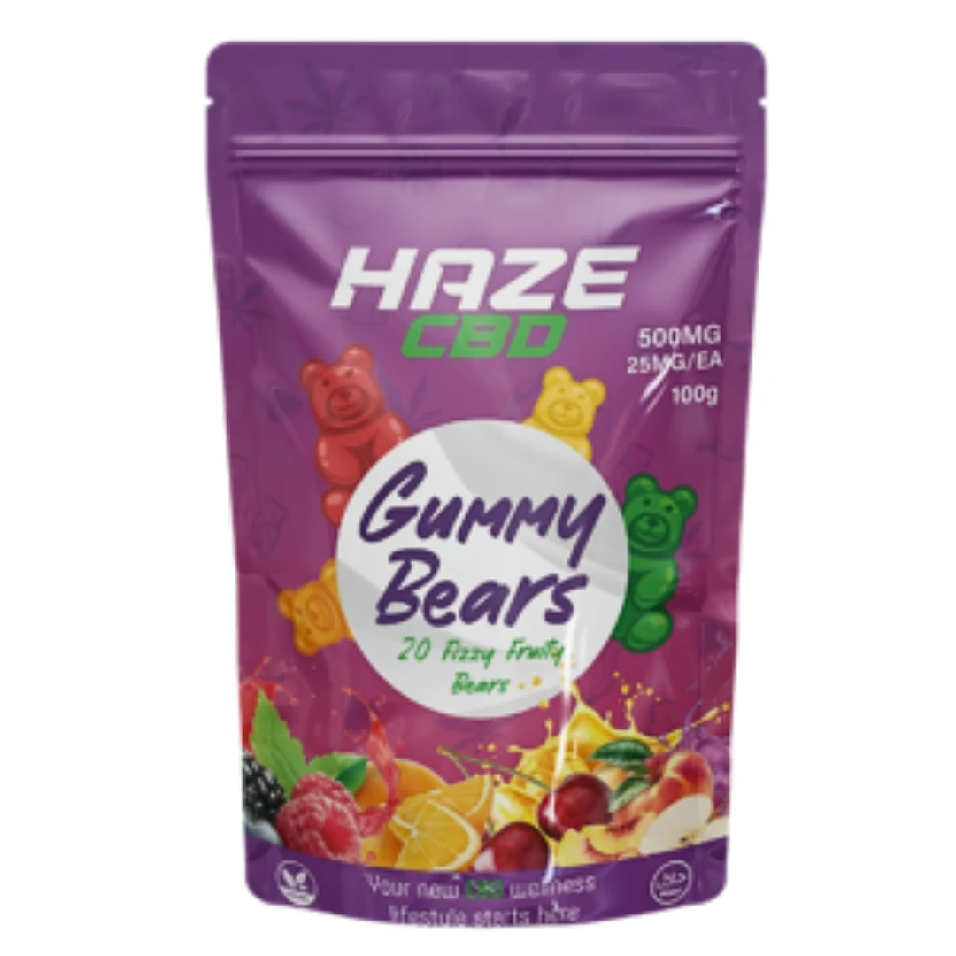 Introducing Haze CBD 1000mg & 500mg Gummy Bears for your CBD wellness routine. Each 100g bag holds 20 fizzy fruity bears, packing 25mg to 50mg of CBD per gummy—a tasty and discreet daily CBD dose.